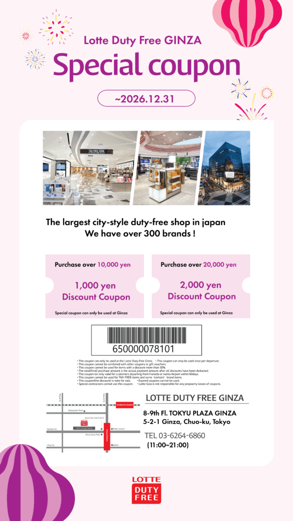 - This coupon can only be used at the Lotte Duty Free Ginza.
